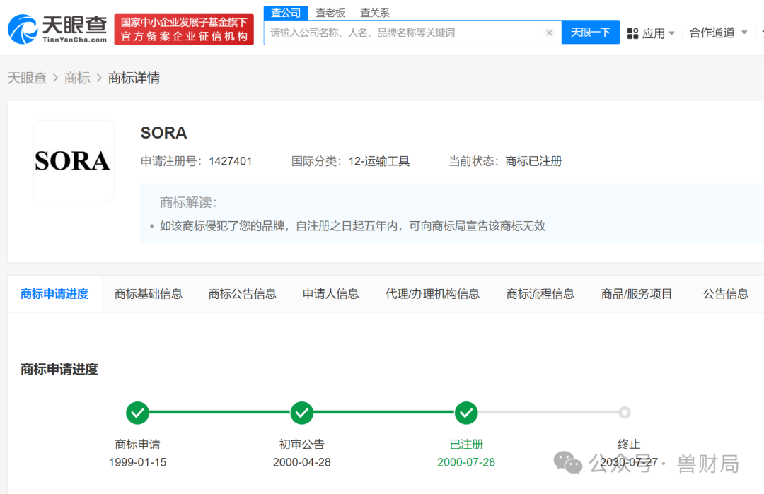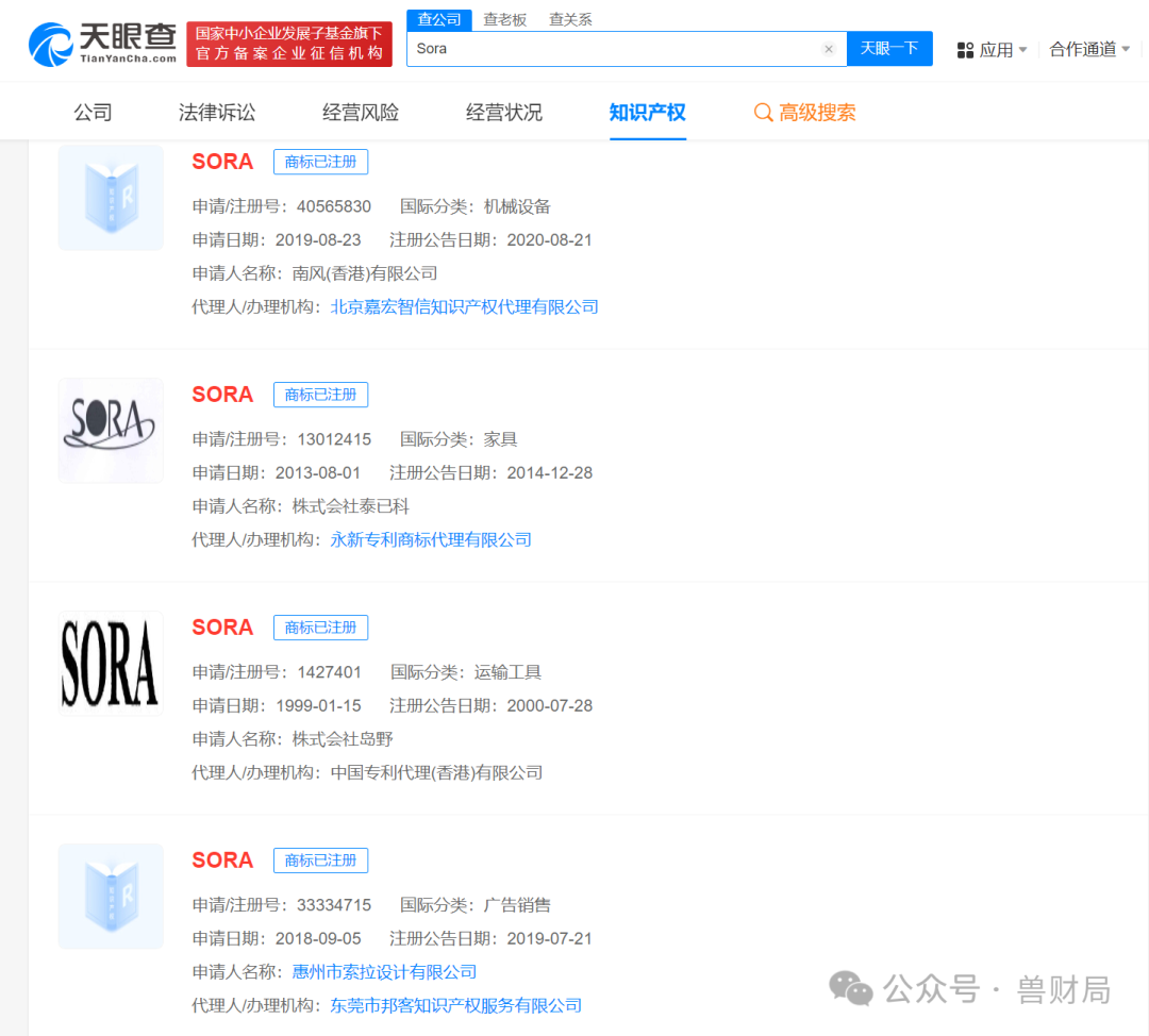 天眼查App顯示,此前,“SORA”已被多方申請(qǐng)注冊(cè)為商標(biāo),申請(qǐng)人包括多家商貿(mào)、科技、餐飲等公司及多個(gè)自然人,國(guó)際分類涉及廣告銷售、運(yùn)輸工具、日化用品等,當(dāng)前商標(biāo)狀態(tài)多為已注冊(cè)。上述商標(biāo)最早申請(qǐng)于1999年,申請(qǐng)人為株式會(huì)社島野,國(guó)際分類為運(yùn)輸工具,該商標(biāo)已于2000年成功注冊(cè)。