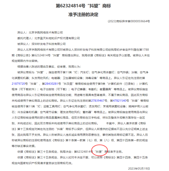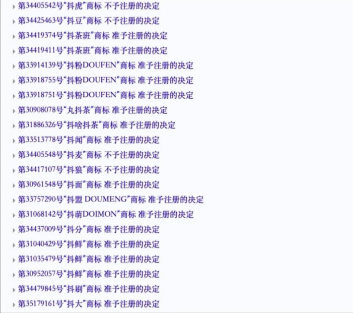 又有多條關(guān)于“抖”系列商標(biāo)準(zhǔn)予注冊的決定。