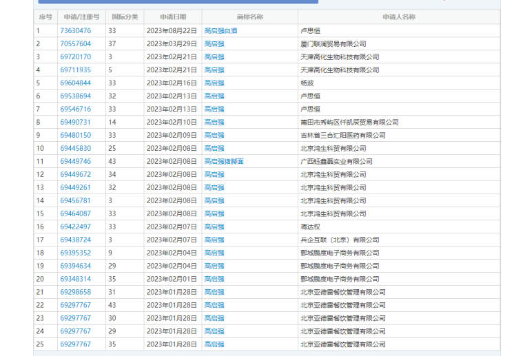 從2023年1月份開始,商標網(wǎng)上顯示有25個不同的申請人注冊“高啟強”名字的商標,無一例外,全部被駁回。
