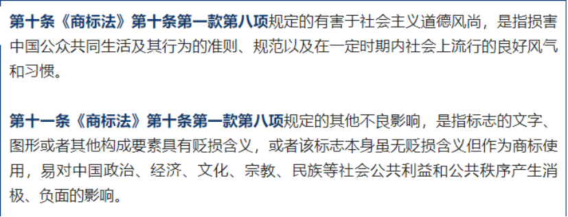 也是無一例外,全部駁回,一個不留。不得不說,審查員也是隨時關注熱點。《商標法》第十條第一款第(八)項規(guī)定,有害于社會主義道德風尚或者有其他不良影響的標志不得作為商標使用?!安坏米鳛樯虡耸褂谩笔侵赋私惯@些標志作為商標注冊外,還禁止上述標志作為商標使用。