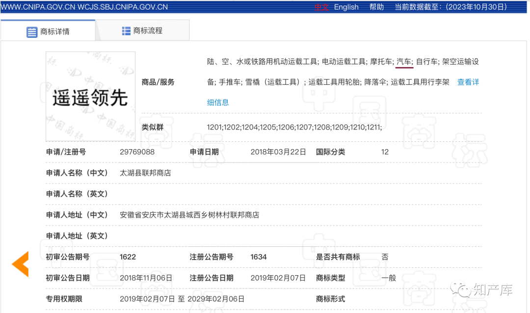 然鵝截至目前,“遙遙領(lǐng)先”商標(biāo)已經(jīng)被申請(qǐng)77次。