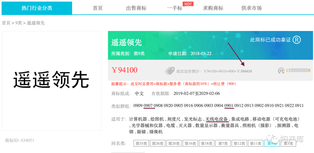 裸標(biāo)¥94100,但成交費(fèi)用=商標(biāo)款¥94100+服務(wù)費(fèi)¥9410(商標(biāo)款的10%)+轉(zhuǎn)讓費(fèi) (900)=10萬+
